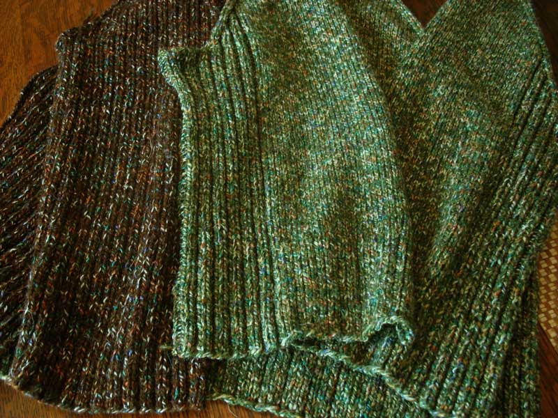 This is a shared sweater here. Matt wore it as much as I did. The fabric is comfy and easy care (just don't wash it in hot water, or it will shrink). It's worth taking the time to fix it. However, I always like to put time between frogging and fixing (or for that matter, problem then frogging... seems less painful if you don't remember how much time it took to knit it before you need to rip back). So I'm not in a rush to get it back on the needles again. I still need to rip all the raglan sleeve shaping back (on both the body and the sleeves). I'll do those one at a time as I work on it.